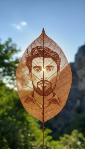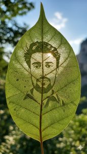 “Leaf carving” images look like real dried leaves that have been precisely cut to form faces, portraits, or patterns. When sunlight passes through the leaf, the design glows beautifully — making it look both natural and artistic.